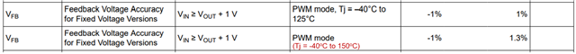 Please refer to the VFB accuracy and load and line regulations specs of TPS628132DQWRWYRQ1 below. The customer needs to consider all 3 parameters in determining the Vout accuracy in their application.