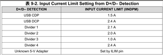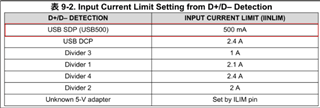 When “D+/D- Detection” is SDP, the Input Current Limit is limited to 500mA.