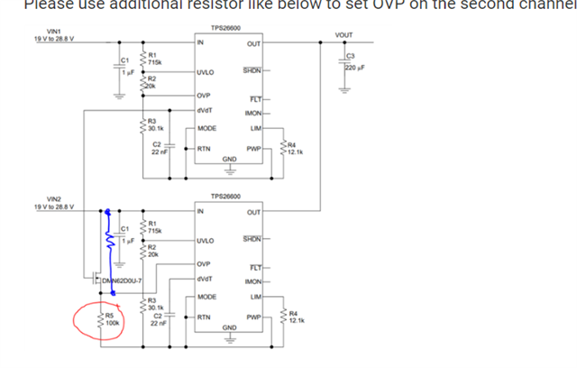 I want to know how the OVP Threshold is set for eFuse2. The Application Report simply states "It is important to note that the secondary eFuse OVP feature is not sacrificed due to the source follower configuration from dVdT to OVP." but it doesn't state where it gets the OVP Threshold from. With just a 100k pull down (R5), the OVP voltage is seemingly just ground and has no way to determine if VIN2 is over the desired threshold.
