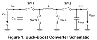 If the device is in buck mode, SW2 is kept closed, SW4 is kept open, and SW1 and SW3 are switching, operating like a synchronous buck converter.