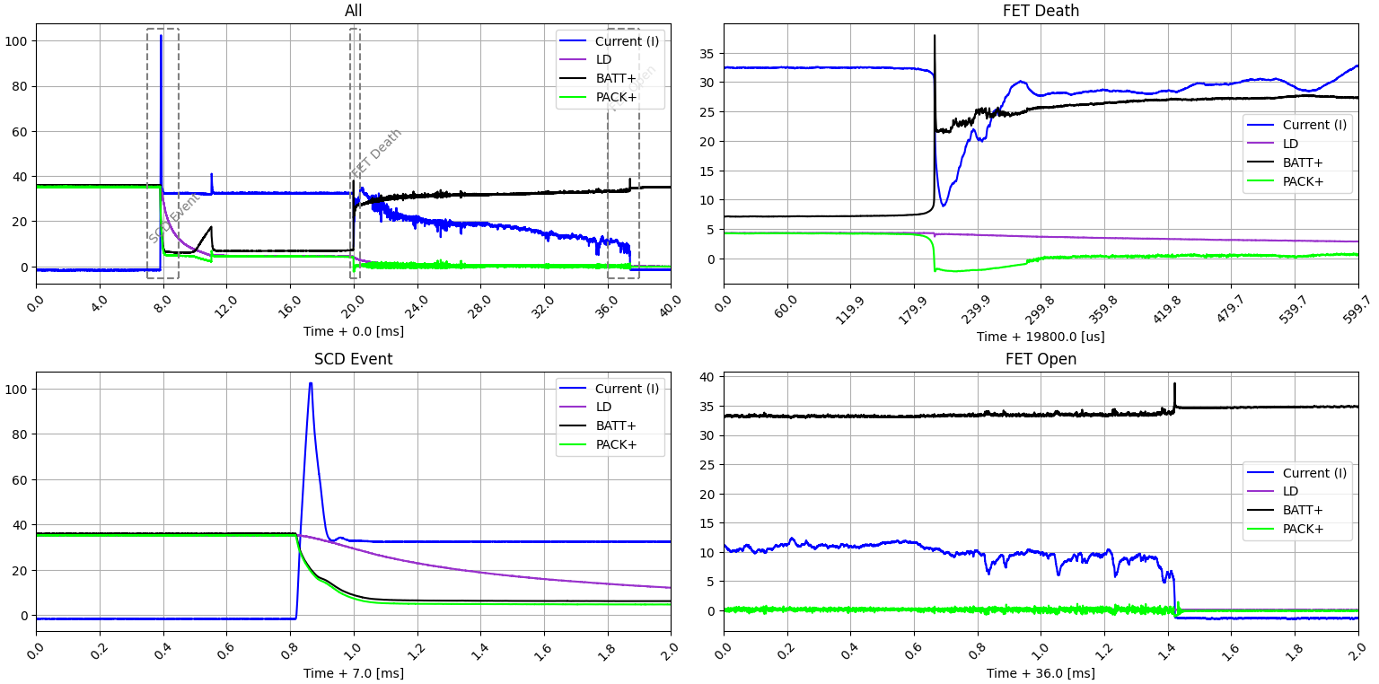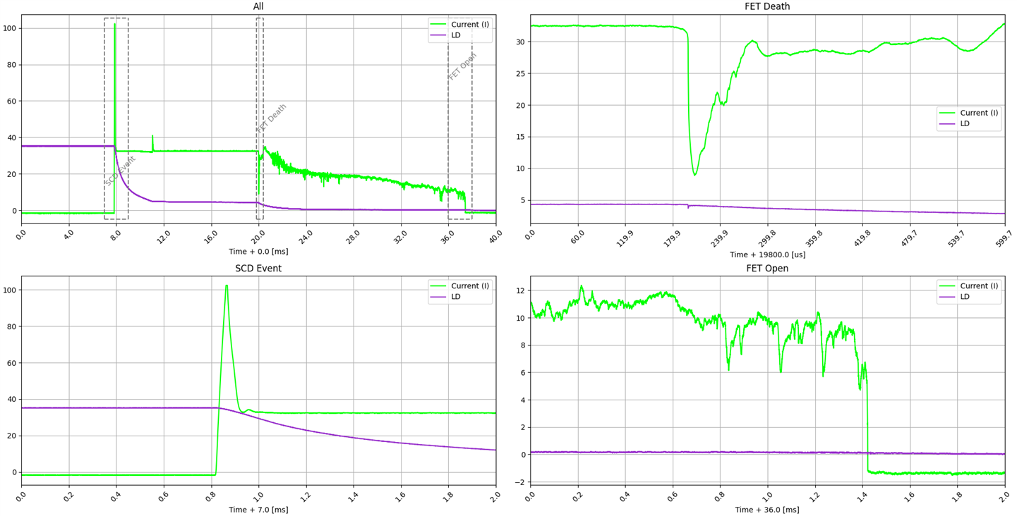 In 'SCD event' plot we can see that the gate voltage drops sharply as the protection kicks in but fails to clamp completely.