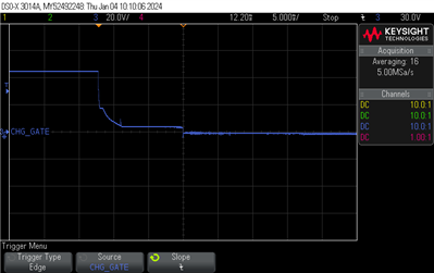 - The Gate drive voltage (RED) is nice and clear of the source voltage (BLUE) value and appears to begin clamping towards 0V to turn off the FETs. Part way through this clamp, something happens where this process stops, the values seem to get stuck and we assume at this point the FETs are blowing.