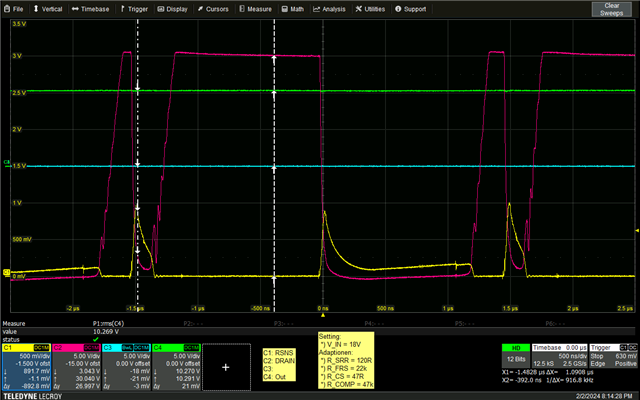Also note the detailed waveforms in the following image (changed rise time of FET via SRR resistor).