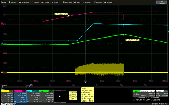 Testing is done via the external adapter and VIN = 18V. However, the TPS23758 seems to have a problem with the reduced primary inductance (changed vom 150µH original to 65µH in the adaption). The output regulates to about 10.5V, the voltage on the FB-Pin is 0.75V instead of 1.75V. Increasing the switching frequency up to 680kHz did not change the behaviour of the circuit. The converter goes in a kind of makro on/off state which depends on the startup timing (CSS capacitor).