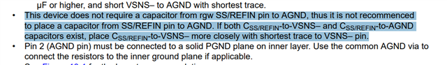 In the simulation a 120nF cap is connected from SS/REFIN pin to AGND, but in the datasheet is not recommended to connect a cap between SS/REFIN and the AGND pin.