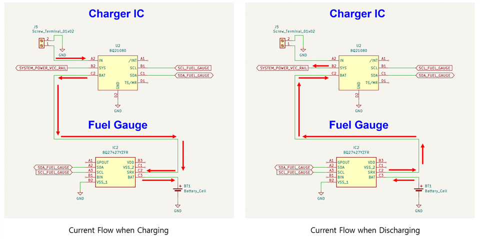 Is this right wiring? For fuel-gauge to monitor the current flow in both charging/discharging phase, I think those two ic should be wired up like below.