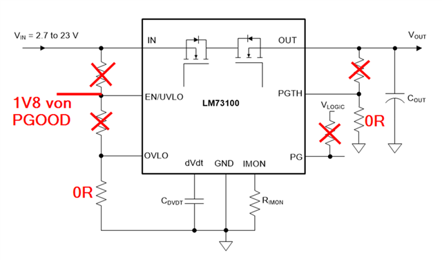 Buck regulator turns on and releases the LM73100 via EN if the voltage is valid. That would take precedence. Alternatively, PoE feeds directly into V_Out on the right,