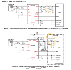 - The datasheet figures 1 and 2 (shown below) says that when using 'With Battery Always Installed), to ensure there is at least 1uF capacitance on the BAT line to GND. But when using for 'Production Test Mode' (not sure what that even is), that >40uF of capacitance is needed on the BAT line to GND.