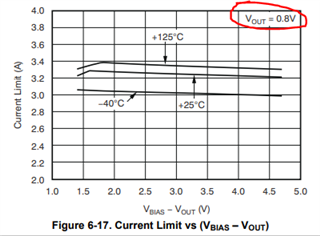 In datasheet of TPS748, condition of typical characteristic with VBIAS=5V for testing. However, figure 6-17 which show current limit curves illustrates relationship between ICL and (VBIAS-VOUT), and Vout = 0.8V is noted at chart, and only figure 6-17 notes Vout=0.8V. From my understanding, this mean that the curves Fig 6-17 are following VBIAS range with Vout=0.8V fix, and it’s totally opposite to electrical conditions. Could you help to clarify the exact mean of Fig 6-17 curves? And have any special reason to write Vout = 0.8V in chart? Thank you.