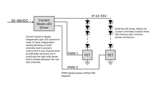 I am trying to design a 100W CC dual channel common anode LED driver. I am looking at using the TPS92682 because it can support my voltage and power requirements and it has 2 channels. Because it will be used with common anode LED strips I would like to use a one channel as the current source on the anode and then use low side PFETs to PWM control each channel on the cathodes side of the LED strip.
