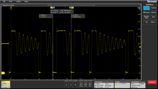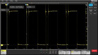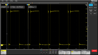 It appears what is occurring is the duty cycle and switching frequency are not stabilizing which is causing the inductor current to rise to a level where the switch overcurrent fault is occurring (IS < 250 mV)