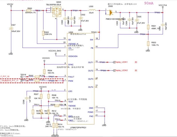 I have attached the schematic diagram below, and their application scenario is that the input voltage is 5V, the output voltage is 17.4V, and the driving load is a display string light, and the working current is about 90mA. Also, they see a description in the datasheet that says "If LED fault is detected, the device continues normal operation and only the faulty string is disabled. The fault is indicated via the FAULT pin which can be released by toggling VDDIO/EN pin low for a short period of 2 µs to 20 µs. LEDs are turned off for this period but the device stays in NORMAL state. If VDDIO/EN is low longer, the device goes to STANDBY and restarts when EN goes high again. This means if the system doesn't want to simply disable the device because of LED faults. It could clear the LED faults by toggling VDDIO/EN pin low for a short period of 2 µs to 20 µs. "