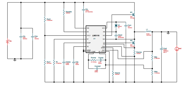 I have created a 12V to (-5V) inverting converter using the LM5116 on Powebench. However, when I build and simulate the recommended design in TINA-TI, I get the "Convergence problem, check analysis parameters".