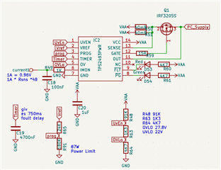 at around 20-21V the current limit state is constantley on. e.g. i am burning 21V0.6A (12W) trough my fet. its heating up way too fast.