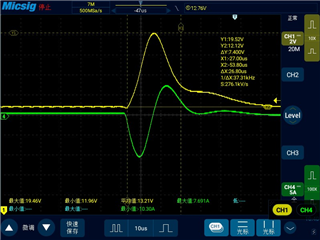 Oscilloscope: Yellow outputs 12V, green outputs 12V current
