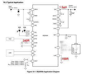 The board is a home-made PCB based on the typical application (see attached) with RICHG set 240R and RILIM set 159R with an aim to set IINDPM 3A and ICHG 2.8A, respectively.