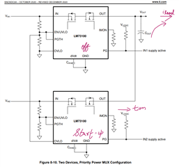 I am working on a new project and were considering using the LM7310 for our purpose. We have two DC power supplies - An SMPS (220VAC/12VDC 50A O/P) and an AUX (12V DC O/P). Till the supply from Mains is available SMPS remains ON and the AUX replaces the SMPS when there is no power available from the mains supply. We are using the standard values of the caps and resistors as given in the datasheet. As per the datasheet, when the circuit is configured according to Priority Power MUXing, the Vout(min) when the power switches between the SMPS to the AUX is as can be seen below in cell B20,C20 and D20 for different values of Cdvdt. Since the voltages obtained here are extremely low, I wanted to know if this is a mistake in my understanding and how to rectify this error.