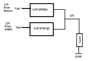 I wanted to design diode ORing controller for Two different 12V power sources. One source 12V DC is from Automotive battery and other 12V from SMPS . Output from battery source need all protections , however 12V output from SMPS needs only reverse polarity protection. So could I use LM74930-Q1 for battery output and LM74700-Q1 for SMPS output as per below configuration.