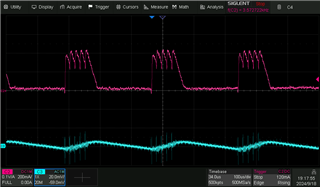 In the attached measurements, the pink waveform is the inductor current, measured with a current probe and the cyan is the feedback (FB) signal (AC coupled to be able to see the slope, measured with a differential probe), measured at a testpoint eTP7.