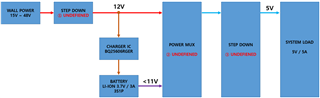 - ①, ③ UNDEFINED (STEP DOWN) and ② UNDEFINED (POWER MUX) should all have sufficient current ratings to supply the system load without causing a voltage drop due to a lack of current or insufficient margin.