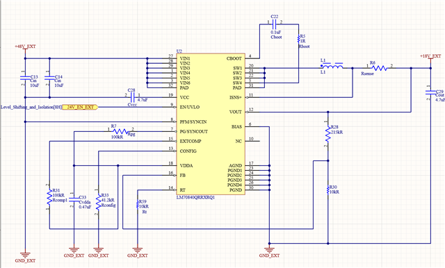 I have implemented LM70840QRRXRQ1 into my design to buck 48V to 18V @ 3A. when pulling ~18V/500mA or more, The 18V rail becomes very noisy and uncontrolled and there is an audible whining that I believe is coming from the switching circuit. Pulling under 500mA, the 18V line is OK.