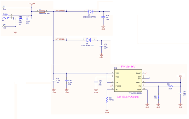 Applying 18VDC to the input of the enclosed circuit works. However, applying 28VDC fries the IC. This part is rated for Vin=36V (Abs.Max=40V), so I'm not sure what's causing the failure. There is no load on the 12V output. There is no overshoot on the 28VDC that is applied to the input.