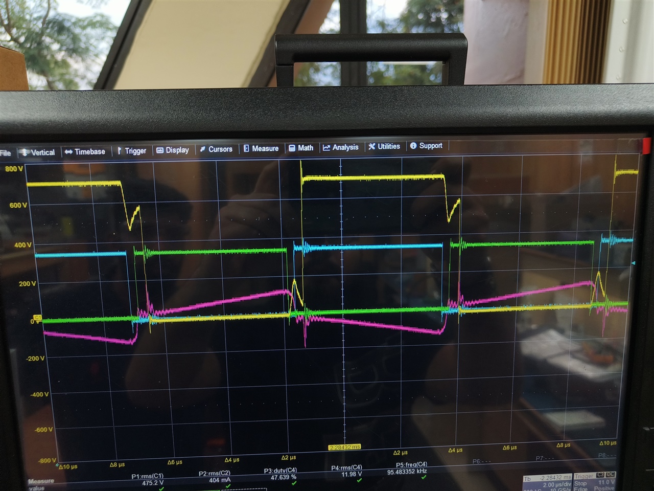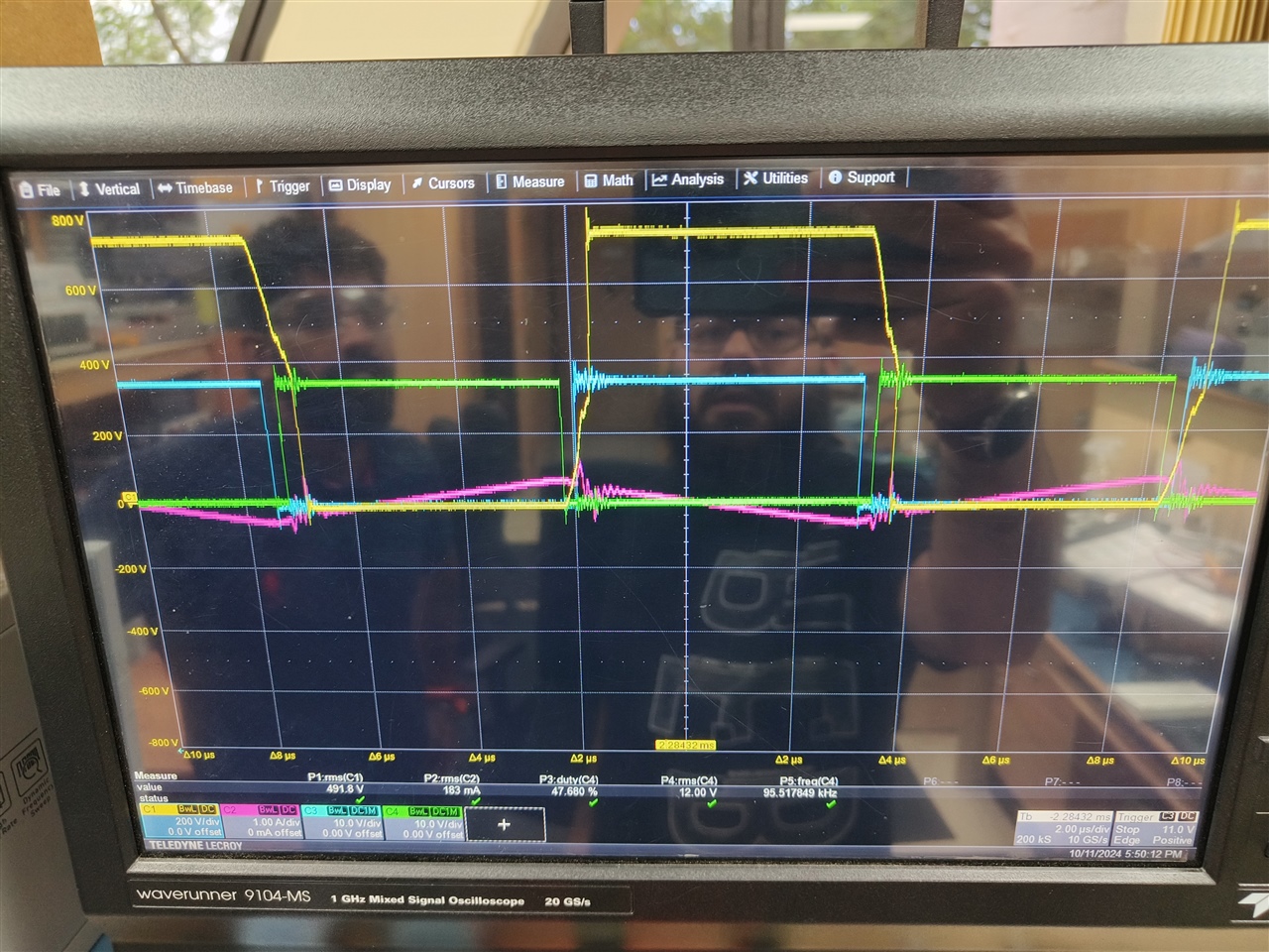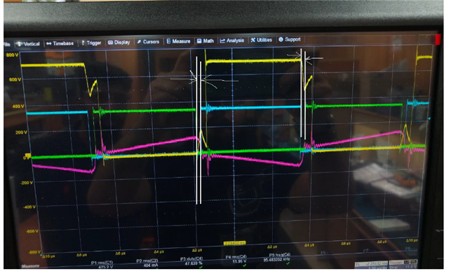 I have set more dead-time just to understand the issue. D Fet Turns OFF / turn ONN properly, coinciding with One of the synchronous gates( Blue ). Whereas B drain to source waveform if you observe, it tries to turn OFF / Turn ONN, but something is preventing it. Should I try adaptive delay option or should i continue with fixed delay option. Is it something to do with Leakage of transformer ? Kindly suggest.