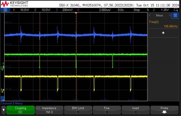 Adjust the input voltage to enter Buck Mode or Boost Mode, and the frequency will revert back to the set 400kHz. However, the conversion voltages for different loads will vary.