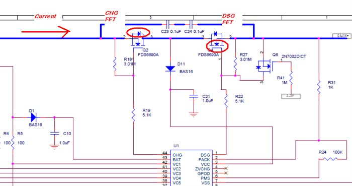 During discharging, (when both CHG & DSG fet are on), current flows in direction as I have indicate by red arrow