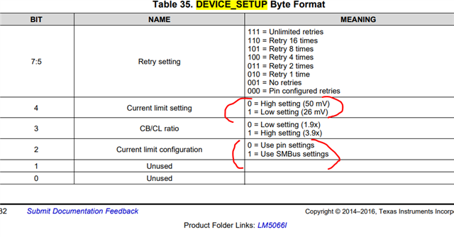 In a LM5066I application, we are reading the DEVICE_SETUP register from the LM5066I, which we see is incorrectly showing Bit 4 (Current limit setting) as a 0 (High setting - 50mV). In this application, the CL pin is pulled up to VDD, so it should be reporting 1 (Low setting - 26mV).