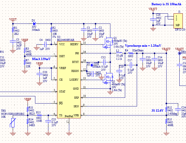 First of all, we are using a small 3S 150mAh battery. We want to have a safe pre-charge so since the "The minimum pre-charge current is clamped to be around 125 mA with default 10-mΩ sensing resistor." as stipulate at page 11, we have use a shunt of 82mOhms to give more gain and lower the pre-charge to about 15mA (1/10C of our small battery). We should now have a safe pre-charge. But despite this above sentence, there is no sign of this behavior in the Functional Block Diagram