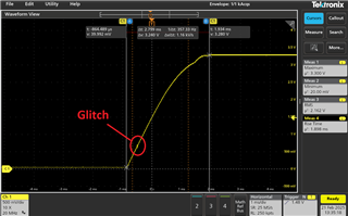 - When measuring the output during turn-on with a 16A load, we observed a glitch in Vout during its ramp-up (pic2).