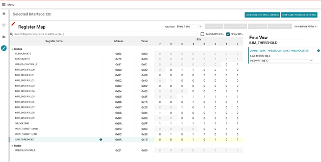 I am using LM51772EVM-HP to debug the constant current function and need to adjust the current through I2C. However, I found that the current is always limited to 5.4A in the constant current state. I tried to modify the internal ILIM_THRESHOLD register to adjust the current limit, but the current value did not change. Can you tell me what I should do?