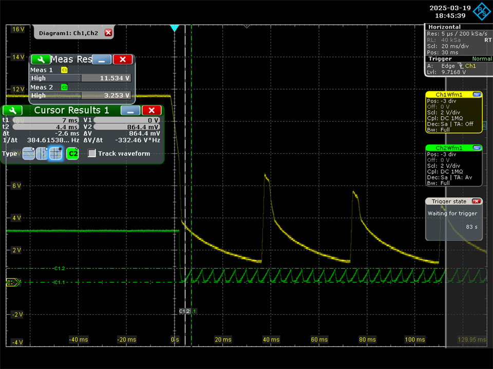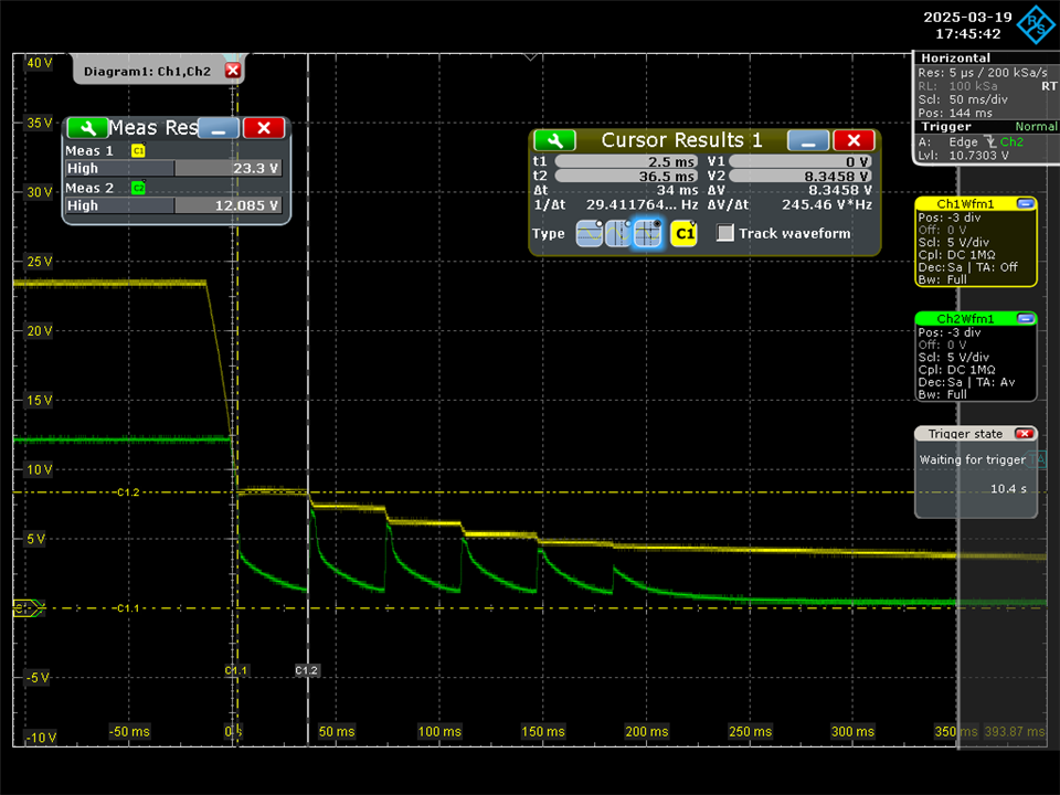 First, I will attach a diagram of the abnormal waveform. The yellow line represents the 24V input, and the green line represents the 12V output.