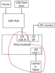 In this setup, the laptop or tablet acts as the USB host, and through the TPS25763-Q1 and a MUX, both DP output and USB 3.1 or 3.2 should be routed to a USB hub, allowing connection to various USB devices.