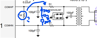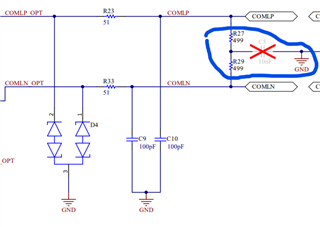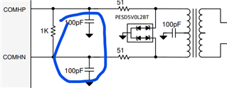 2. Why on datasheet there's simply an 1k resistor across P&N wire but in EVM it's separated into 2*499R resistors plus 1 10nF capacitor to GND (but the capacitor didn't connect)? Is it ok if I only use below connection with 2*510R resistors+ 10nF capacitor to GND, like the EVM does? Whta's the design tip here?