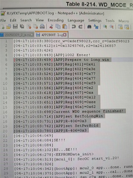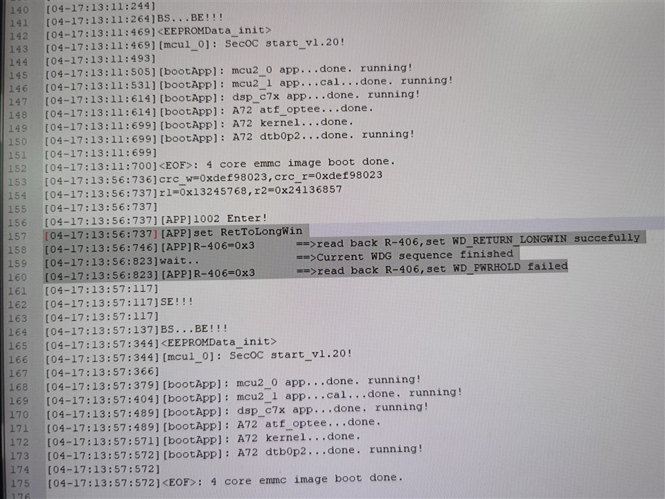 Now I try to integrate TPS6594 WDG driver into TDA4VL SDK,the watchdog will work in Q&A mode.My SDK version is pdk_j721s2_08_05_00_36. The watchdog works normality in MCU1_0.When I need to upgrade software,I have encountered the following problem:
