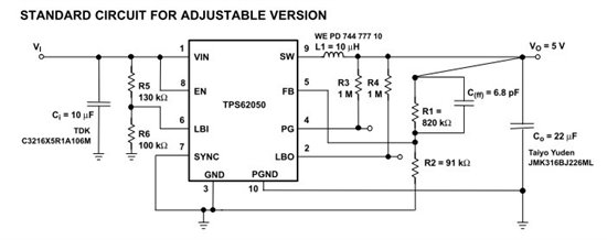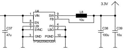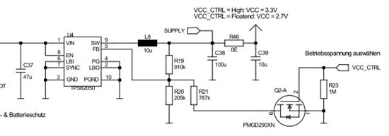 in an earlier revision we were using the TPS62056 (3.3V fixed output). Now we switched to the version with adjustable output TPS62050. We are using the switch converter with a external resistor divider. Using a FET driven by a micro controller one of the resistor values can be changed. So we are able to get 2.7 or 3.3V depending on the FET's state. (see schematics at the end)