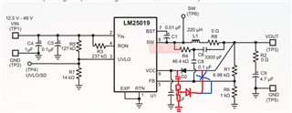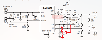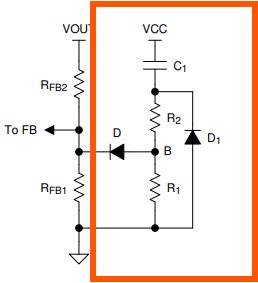 The part shown in the red box is the external soft-start circuit. The diode D should be connected to the FB pin and cap C1 should be connected to VCC pin of the device as shown. RFB1 and RFB2 are the feedback resistor dividers which will be present in the application circuit.