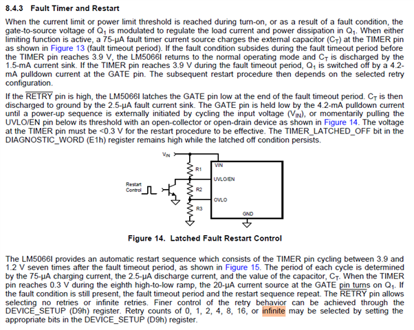 I have a question regarding the fault timer of LM5066I. LM5066I can cahnge the number of retry count from 0 to infinte. What is the infinite? How fo we understand the operation of the retry count of infinite?