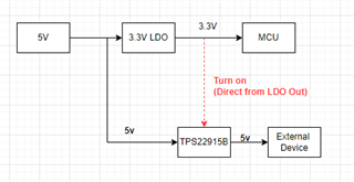 When the 3.3V LDO is turned on, I want this 3.3V power to go to the ON pin of the TPS22915B and automatically turn on the External 5V Device through TPS22915B.