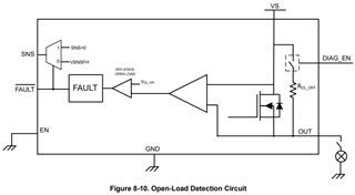 When I connect a 22R load resistor to the output, the part appears to behave normally. The heating stops, and the current draw from my 28 V supply drops by about 7 mA. SNS pin now reads 0, and nFAULT is deasserted.