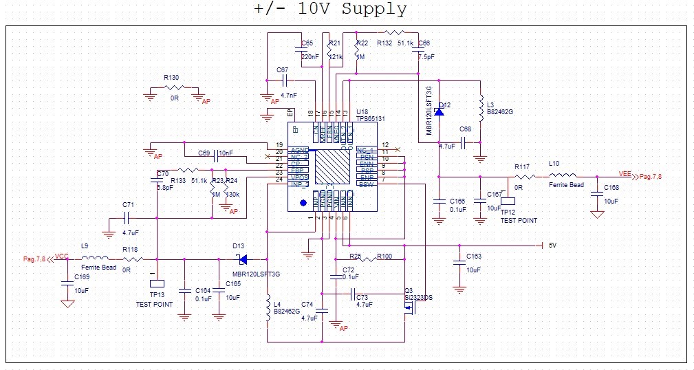 I used the TPS65131 in my project to have a dual power supply following the application notes and the routing of the evaluation board. When I power the board I hear an annoying buzz. I checked the schematic, PCB, power supplies and everything else but I didn't find any particular inconsistencies. If I put my finger on C70/R133 the noise fades a lot becoming almost imperceptible.