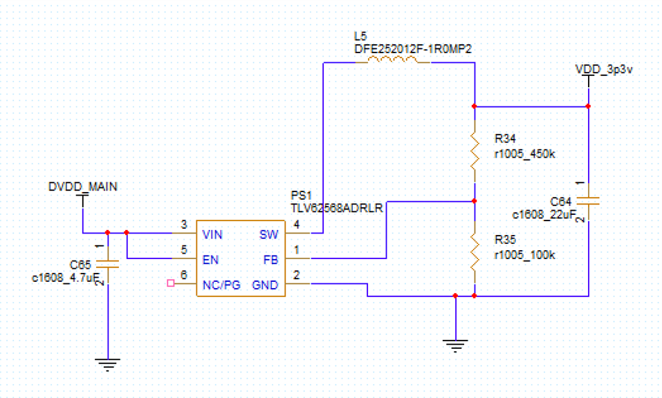 The customer configured a circuit that receives DVDD_MAIN (3.5-5.5V) input using TLV62568 and generates 3.3V.