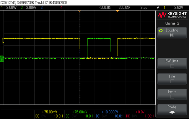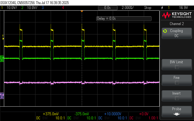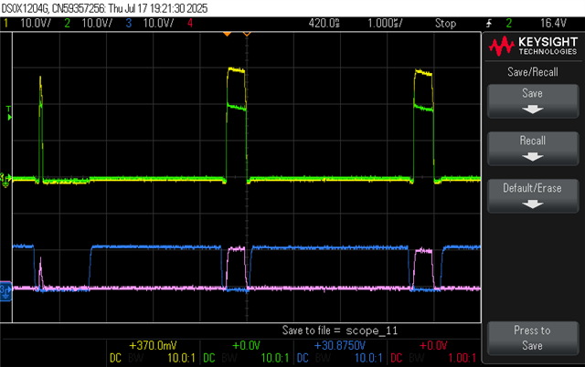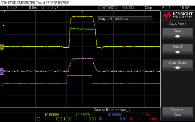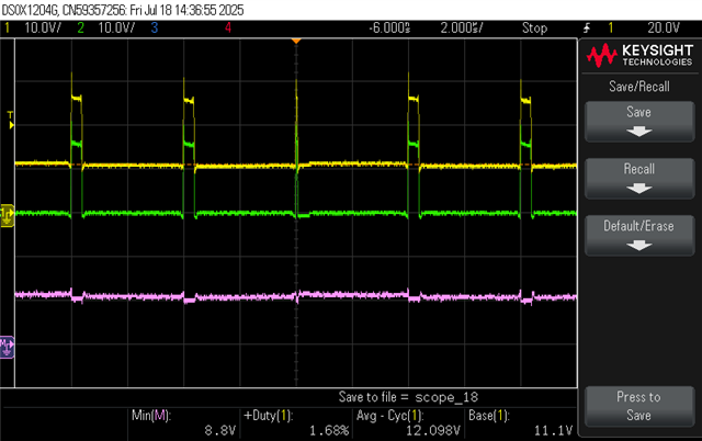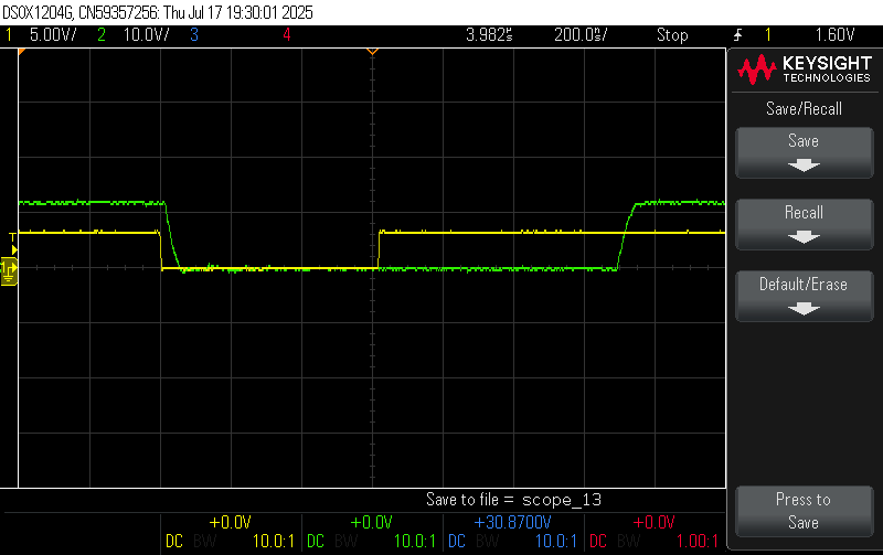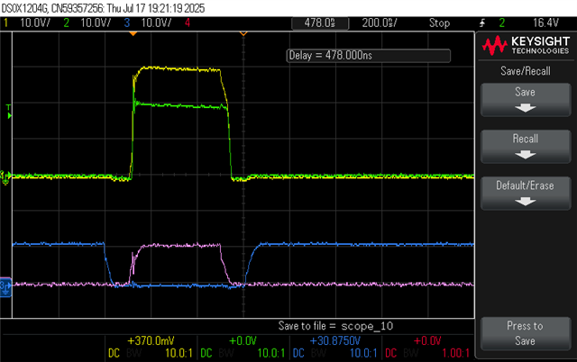 - HI and LI seem to be stable, i measured HI and LI against GND near the Gate Driver. While the length of the Pulse on HI and LI stay stable, the Pulses on HO are sporadically shorter.