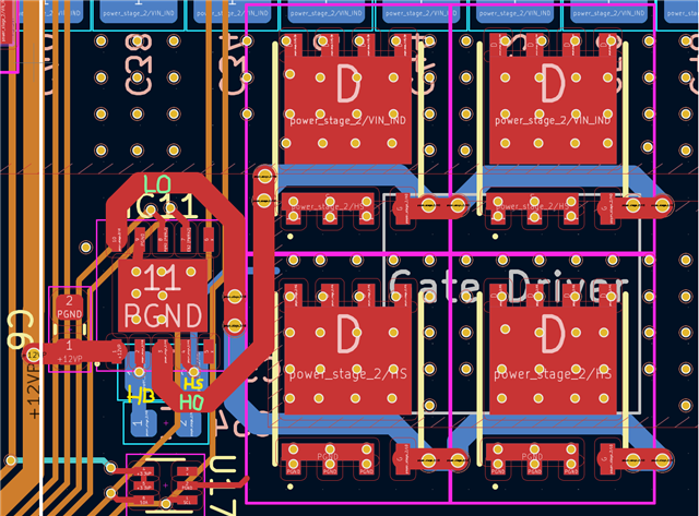 In the next iteration of my design i am planning to shorten HO and LO traces as much as possible. Furthermore, the Bootstrap capacitor will be placed on the upper side next to the Gate driver and decreased to 100nF.