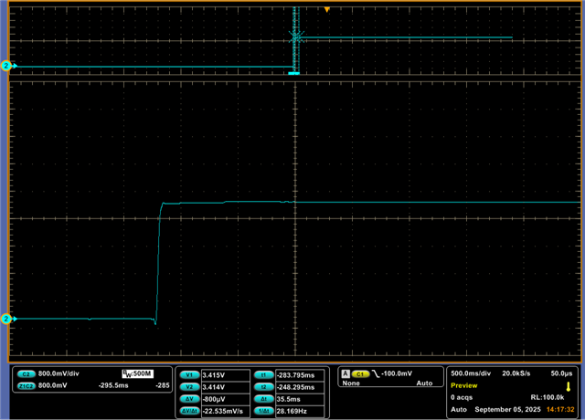 When initializing the BQ76952 chip, the VDD50 was found to drop.As shown as the pciture,the channel 1 is VDD50 ,When the BMS is activated, the VDD50 will drop to 0V for about tens of milliseconds.