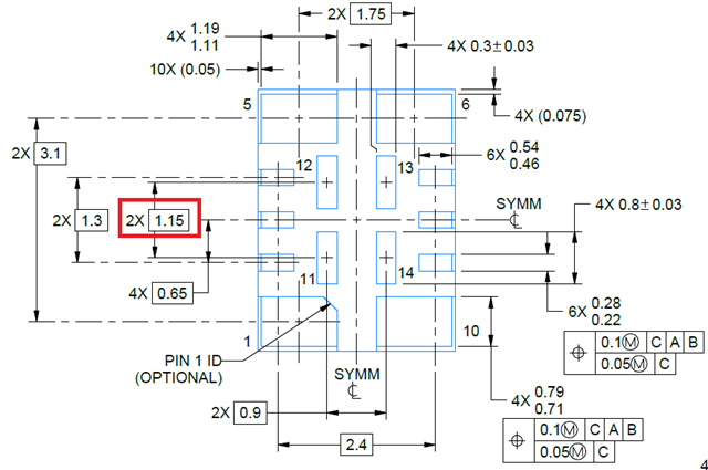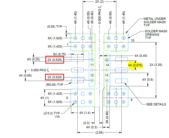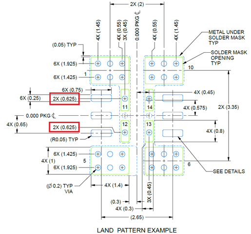 It appears that the land pattern example on p32 of the datasheet for the SIE package does not match the pin locations for pins 11-14. Both the pad and mask are 0.8mm long but the center of the pin is at a vertical offset of 1.15/2 = 0.575mm and the center of the mask opening is at a vertical offset of 0.625mm. The footprint from Ultralibrarian has the mask openings at the same offset as the pins (0.575mm). Is the 0.625mm dimension in the land pattern figure a typo (in both places where it is shown)? Is this an intentional offset (seems unlikely)?