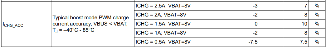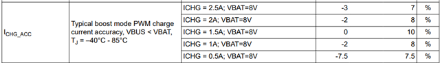 The datasheet specifies the current accuracy when charging a 2cells battery in boost mode, but does the accuracy tend to be worse than the specified accuracy when charging 4 cells?