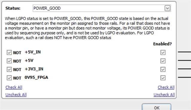 I am trying to set the configuration for the logic controlled GPOS. On one side of the logic gate i have 3 GPI signals and on the other side of the logic i have selected all the power goods and using OR logic want the output to drive low if any of the power goods status become unhappy. Is it possible to see the status of these in real time as currently during testing i lower the voltage but it does not drive the output.